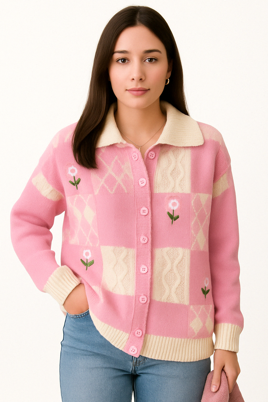 Zodra je dit vest aantrekt, voel je het meteen: zacht, vrolijk en vertrouwd. De combinatie van gebreide ruiten en subtiele bloemenborduursels geeft dit vest een speelse, bijna nostalgische uitstraling. Dankzij de comfortabele pasvorm en het zachte materiaal kun je hem de hele dag dragen – van een relaxte ochtendwandeling tot een gezellige koffiedate. En die knoopsluiting en kraag? Die maken ‘m net even wat specialer.