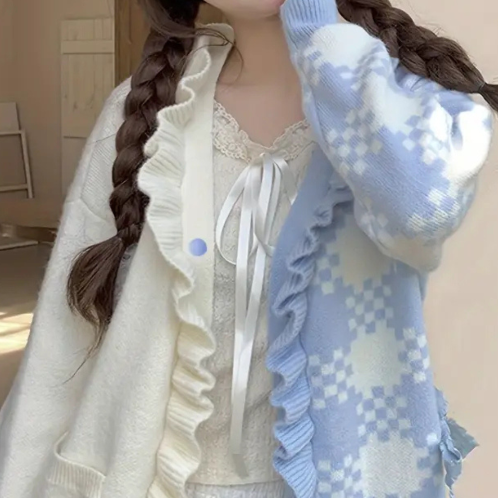 Dames Gebreid Vest met Geruite Print en Ruches Zacht Materiaal en Losvallend Model