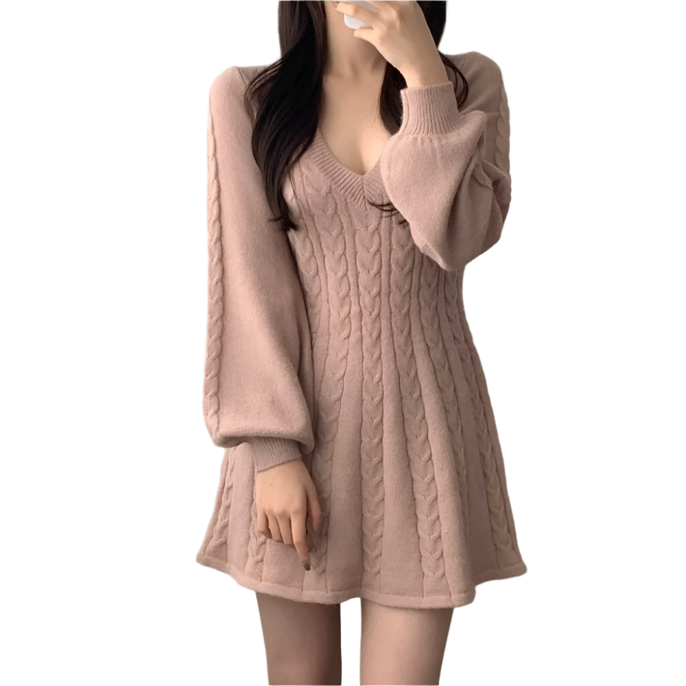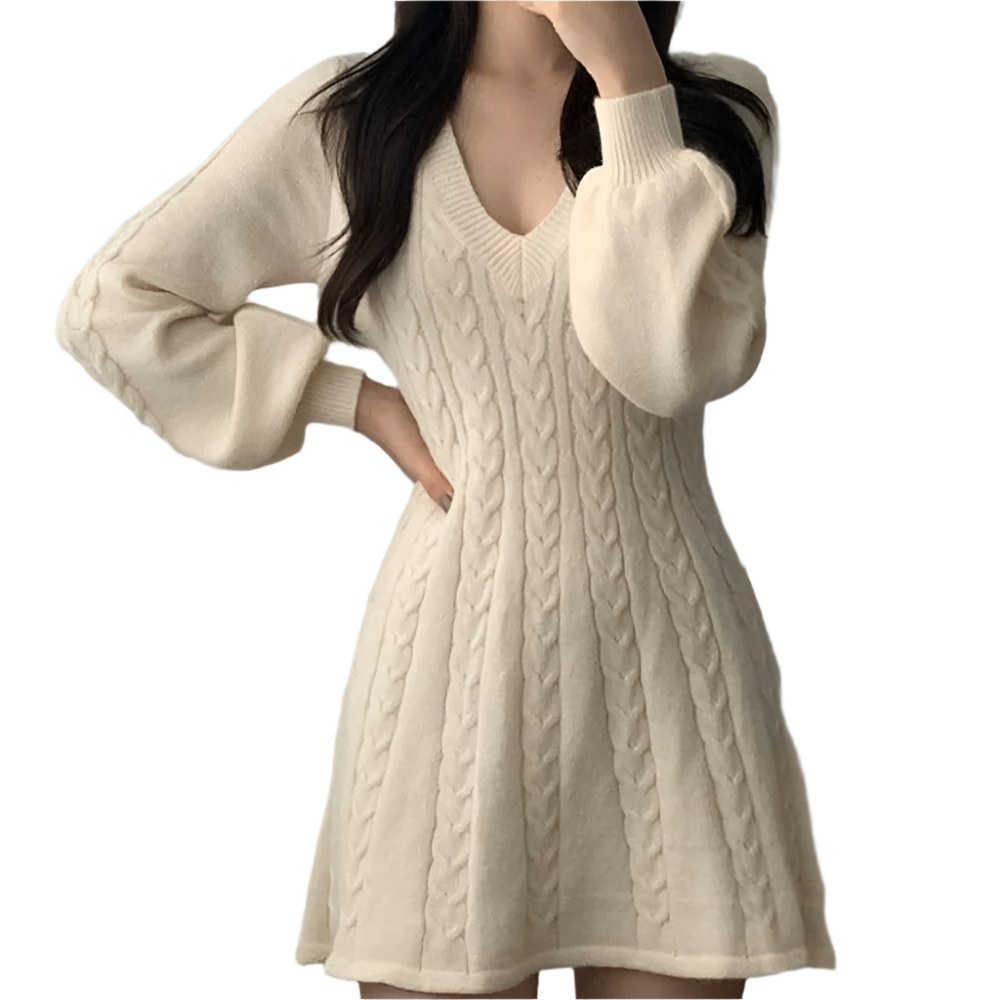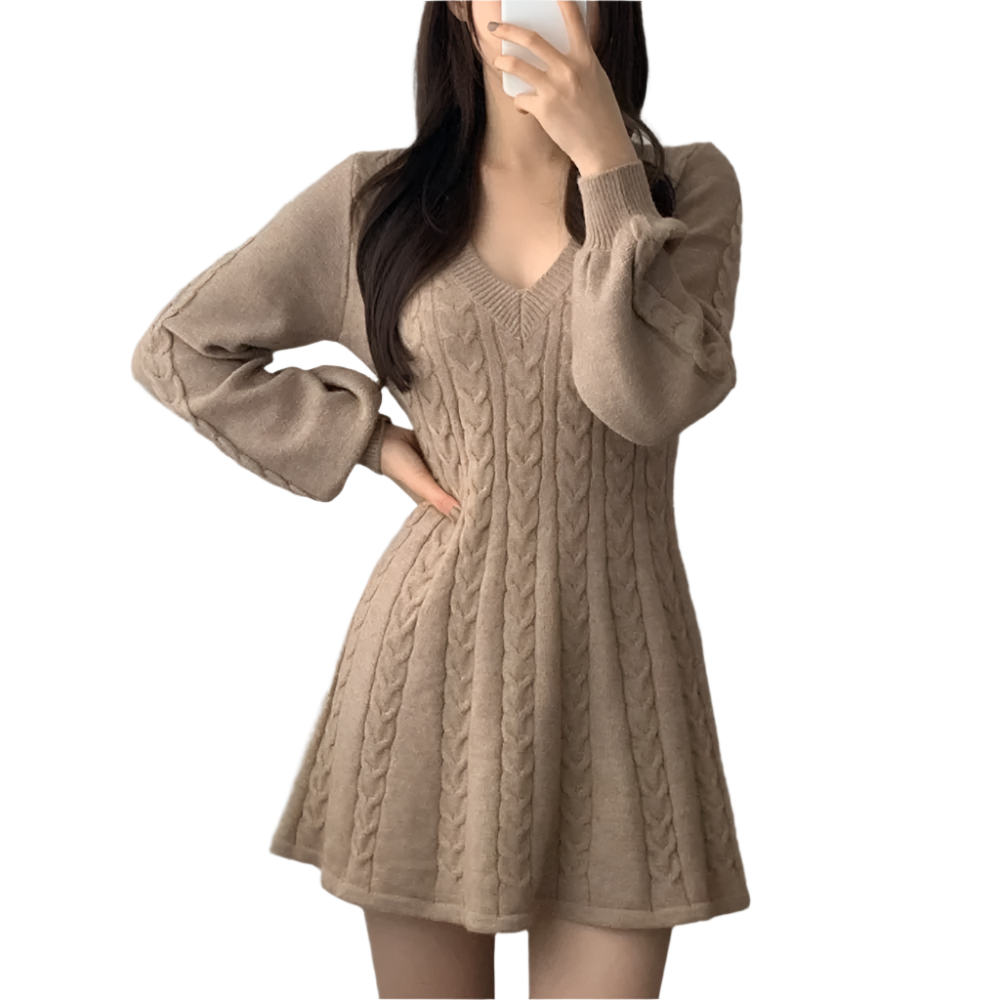 Dames Gebreide Jurk met V-hals en A-lijn Vorm Kabelpatroon en Lange Mouwen