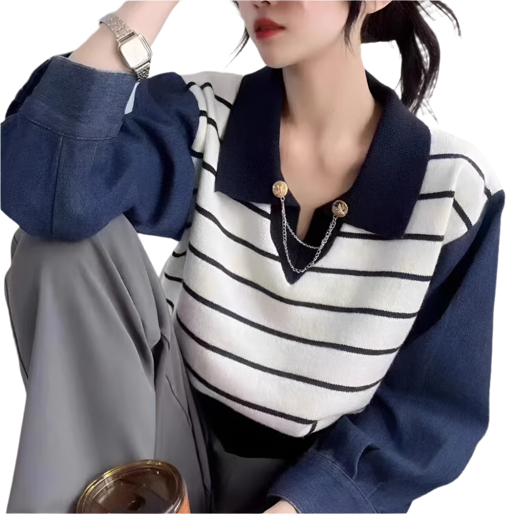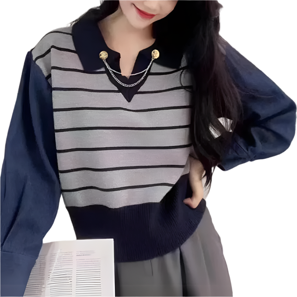 Dames gestreepte trui met kraag en kettingdetail casual chic voor elk seizoen