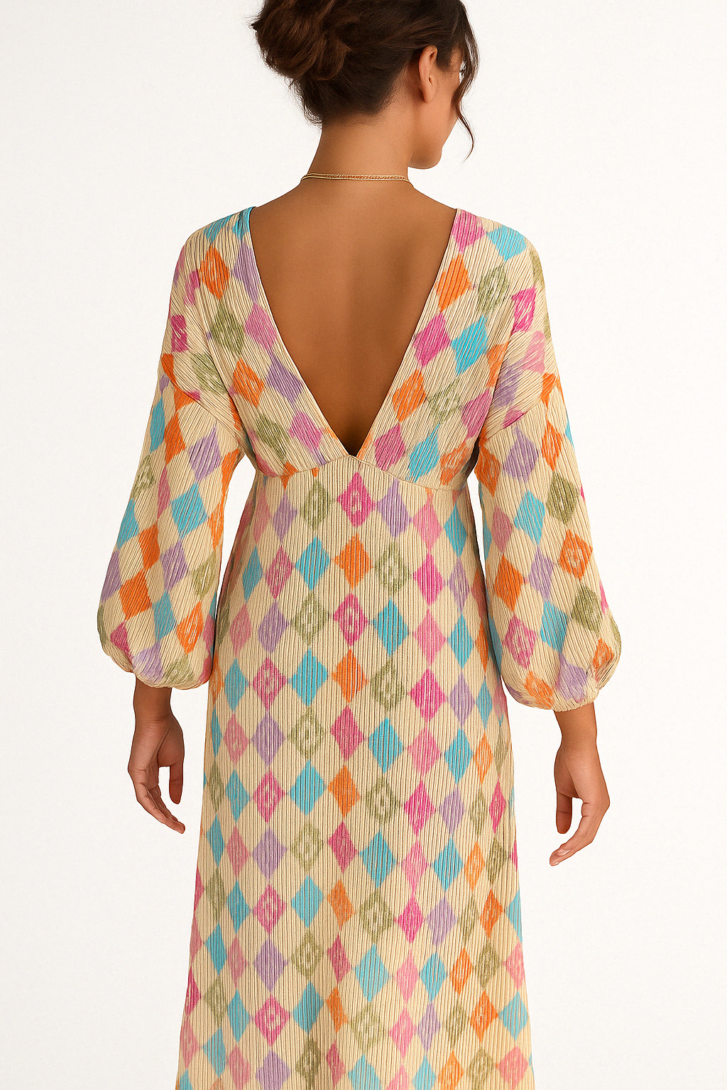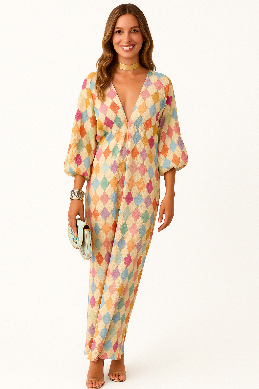 Deze maxi jurk is een echte blikvanger voor zonnige dagen. De soepele stof valt losjes om het lichaam en beweegt mooi mee terwijl je loopt. De diepe V-hals en de ballonmouwen geven de jurk een luchtige en elegante uitstraling. Het kleurrijke ruitpatroon zorgt voor een speels effect dat perfect past bij stranddagen, vakanties of een zomerse avond uit.