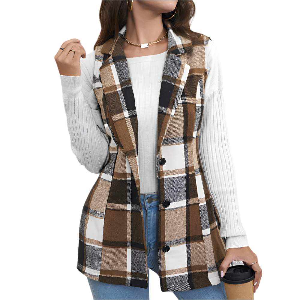 Dames Mouwloos Lang Gilet met Ruitpatroon Modieuze Eyecatcher voor Elk Seizoen